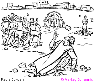 Stephanus, voll heiligen Geistes, sah auf zum Himmel und sah die Herrlichkeit Gottes und Jesus stehen zur Rechten Gottes und sprach: Siehe, ich sehe den Himmel offen und den Menschensohn zur Rechten Gottes stehen. Sie schrien aber laut und hielten sich ihre Ohren zu und stürmten einmütig auf ihn ein, stießen ihn zur Stadt hinaus und steinigten ihn. Und die Zeugen legten ihre Kleider ab zu den Füßen eines jungen Mannes, der hieß Saulus, und sie steinigten Stephanus; der rief den Herrn an und sprach: Herr Jesus, nimm meinen Geist auf! Er fiel auf die Knie und schrie laut: Herr, rechne ihnen diese Sünde nicht an! Und als er das gesagt hatte, verschied er.