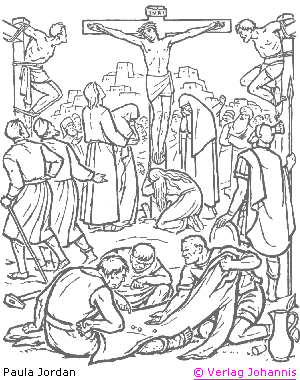 Da überantwortete er ihnen Jesus, daß er gekreuzigt würde. Sie nahmen ihn aber, und er trug sein Kreuz und ging hinaus zur Stätte, die da heißt Schädelstätte, auf hebräisch Golgatha. Dort kreuzigten sie ihn und mit ihm zwei andere zu beiden Seiten, Jesus aber in der Mitte. Pilatus aber schrieb eine Aufschrift und setzte sie auf das Kreuz; und es war geschrieben: Jesus von Nazareth, der König der Juden. Diese Aufschrift lasen viele Juden, denn die Stätte, wo Jesus gekreuzigt wurde, war nahe bei der Stadt. Und es war geschrieben in hebräischer, lateinischer und griechischer Sprache. Da sprachen die Hohenpriester der Juden zu Pilatus: Schreib nicht: Der König der Juden, sondern, daß er gesagt hat: Ich bin der König der Juden. Pilatus antwortete: Was ich geschrieben habe, das habe ich geschrieben. Als aber die Soldaten Jesus gekreuzigt hatten, nahmen sie seine Kleider und machten vier Teile, für jeden Soldaten einen Teil, dazu auch das Gewand. Das war aber ungenäht, von oben an gewebt in einem Stück. Da sprachen sie untereinander: Laßt uns das nicht zerteilen, sondern darum losen, wem es gehören soll. So sollte die Schrift erfüllt werden, die sagt: »Sie haben meine Kleider unter sich geteilt und haben über mein Gewand das Los geworfen.« Das taten die Soldaten. Es standen aber bei dem Kreuz Jesu seine Mutter und seiner Mutter Schwester, Maria, die Frau des Klopas, und Maria von Magdala. Als nun Jesus seine Mutter sah und bei ihr den Jünger, den er liebhatte, spricht er zu seiner Mutter: Frau, siehe, das ist dein Sohn! Danach spricht er zu dem Jünger: Siehe, das ist deine Mutter! Und von der Stunde an nahm sie der Jünger zu sich. Danach, als Jesus wußte, daß schon alles vollbracht war, spricht er, damit die Schrift erfüllt würde: Mich dürstet. Da stand ein Gefäß voll Essig. Sie aber füllten einen Schwamm mit Essig und steckten ihn auf ein Ysoprohr und hielten es ihm an den Mund. Als nun Jesus den Essig genommen hatte, sprach er: Es ist vollbracht! und neigte das Haupt und verschied.