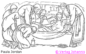 Danach bat Josef von Arimathäa, der ein Jünger Jesu war, doch heimlich, aus Furcht vor den Juden, den Pilatus, daß er den Leichnam Jesu abnehmen dürfe. Und Pilatus erlaubte es. Da kam er und nahm den Leichnam Jesu ab. Es kam aber auch Nikodemus, der vormals in der Nacht zu Jesus gekommen war, und brachte Myrrhe gemischt mit Aloe, etwa hundert Pfund. Da nahmen sie den Leichnam Jesu und banden ihn in Leinentücher mit wohlriechenden Ölen, wie die Juden zu begraben pflegen. Es war aber an der Stätte, wo er gekreuzigt wurde, ein Garten und im Garten ein neues Grab, in das noch nie jemand gelegt worden war. Dahin legten sie Jesus wegen des Rüsttags der Juden, weil das Grab nahe war.