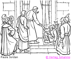 Petrus {aber} und Johannes gingen hinauf in den Tempel um die neunte Stunde, zur Gebetszeit. Und es wurde ein Mann herbeigetragen, lahm von Mutterleibe; den setzte man täglich vor die Tür des Tempels, die da heißt die Schöne, damit er um Almosen bettelte bei denen, die in den Tempel gingen. Als er nun Petrus und Johannes sah, wie sie in den Tempel hineingehen wollten, bat er um ein Almosen. Petrus aber blickte ihn an mit Johannes und sprach: Sieh uns an! Und er sah sie an und wartete darauf, daß er etwas von ihnen empfinge. Petrus aber sprach: Silber und Gold habe ich nicht; was ich aber habe, das gebe ich dir: Im Namen Jesu Christi von Nazareth steh auf und geh umher! Und er ergriff ihn bei der rechten Hand und richtete ihn auf. Sogleich wurden seine Füße und Knöchel fest, er sprang auf, konnte gehen und stehen und ging mit ihnen in den Tempel, lief und sprang umher und lobte Gott. Und es sah ihn alles Volk umhergehen und Gott loben. Sie erkannten ihn auch, daß er es war, der vor der Schönen Tür des Tempels gesessen und um Almosen gebettelt hatte; und Verwunderung und Entsetzen erfüllte sie über das, was ihm widerfahren war.
