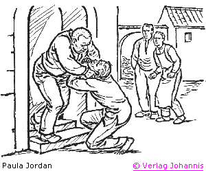 Da ging dieser Knecht hinaus und traf einen seiner Mitknechte, der war ihm hundert Silbergroschen schuldig; und er packte und würgte ihn und sprach: Bezahle, was du mir schuldig bist! Da fiel sein Mitknecht nieder und bat ihn und sprach: Hab Geduld mit mir; ich will dir's bezahlen. Er wollte aber nicht, sondern ging hin und warf ihn ins Gefängnis, bis er bezahlt hätte, was er schuldig war. Als aber seine Mitknechte das sahen, wurden sie sehr betrübt und kamen und brachten bei ihrem Herrn alles vor, was sich begeben hatte. Da forderte ihn sein Herr vor sich und sprach zu ihm: Du böser Knecht! Deine ganze Schuld habe ich dir erlassen, weil du mich gebeten hast; hättest du dich da nicht auch erbarmen sollen über deinen Mitknecht, wie ich mich über dich erbarmt habe? Und sein Herr wurde zornig und überantwortete ihn den Peinigern, bis er alles bezahlt hätte, was er ihm schuldig war. So wird auch mein himmlischer Vater an euch tun, wenn ihr einander nicht von Herzen vergebt, ein jeder seinem Bruder.