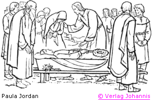 {Und} es begab sich danach, daß Jesus [er] in eine Stadt mit Namen Nain ging; und seine Jünger gingen mit ihm und eine große Menge. Als er aber nahe an das Stadttor kam, siehe, da trug man einen Toten heraus, der der einzige Sohn seiner Mutter war, und sie war eine Witwe; und eine große Menge aus der Stadt ging mit ihr. Und als sie der Herr sah, jammerte sie ihn, und er sprach zu ihr: Weine nicht! Und trat hinzu und berührte den Sarg, und die Träger blieben stehen. Und er sprach: Jüngling, ich sage dir, steh auf! Und der Tote richtete sich auf und fing an zu reden, und Jesus gab ihn seiner Mutter. Und Furcht ergriff sie alle, und sie priesen Gott und sprachen: Es ist ein großer Prophet unter uns aufgestanden, und: Gott hat sein Volk besucht.